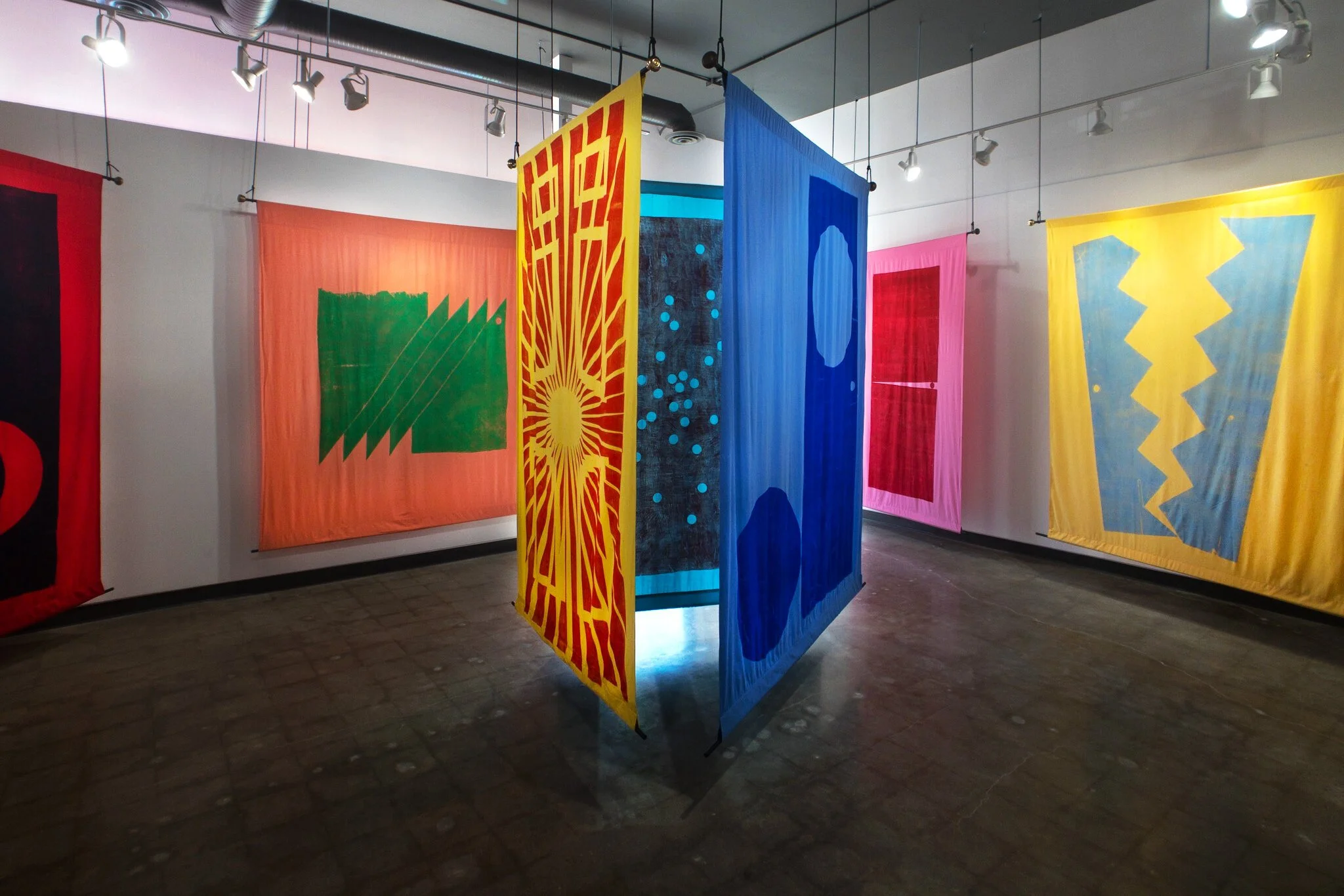 Relief prints of salvaged doors on bedsheets, dowels, rope, doorknobs, 2021