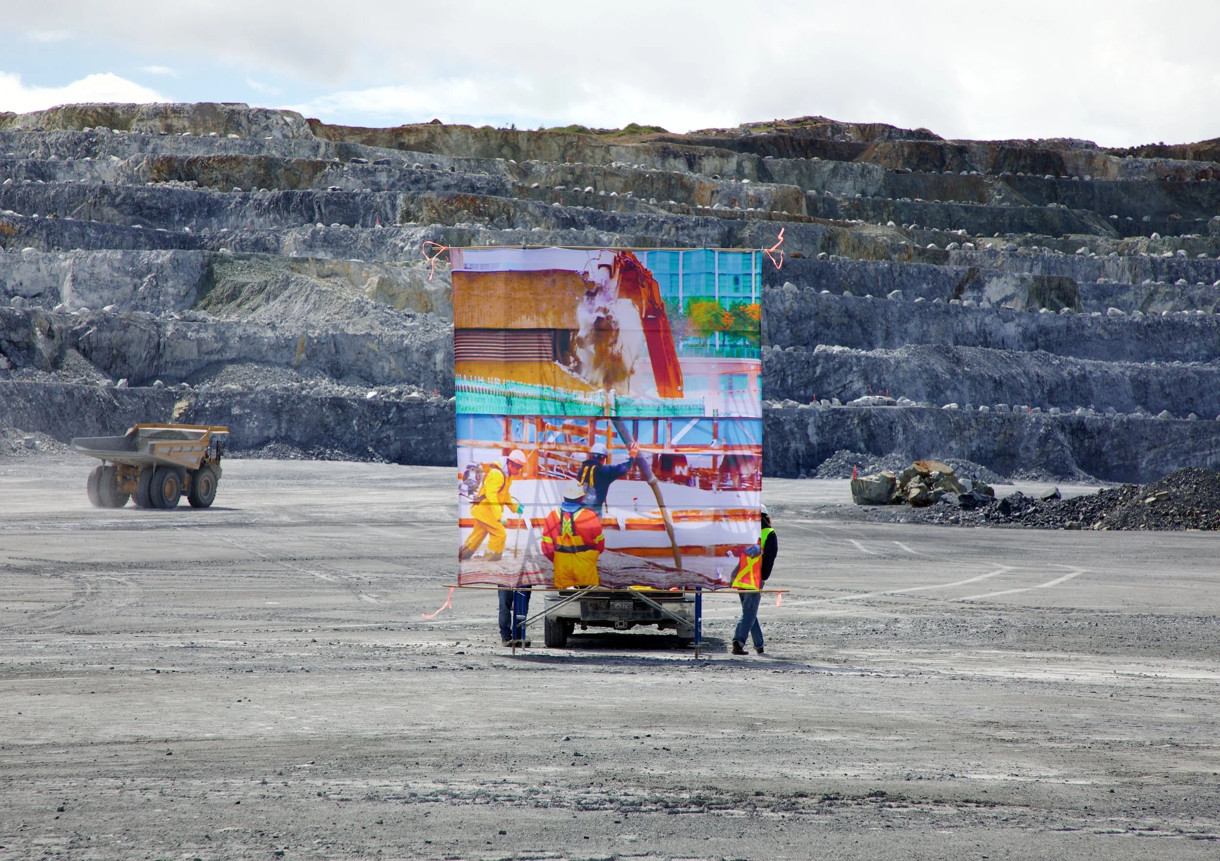 Every Day Is New in the City (Texada) considers the linked transformation of Vancouver's downtown landscape and a 900 hectare limestone quarry on Texada Island—the major supplier of the limestone used in city’s concrete construction. Working with the CBC archives, imagery was sourced related to the 2010 Olympic construction boom which marked a significant shift in Vancouver's redevelopment. The archival images were printed onto textiles and installed at the active quarry on Texada Island, the largest of the local Gulf Islands.